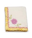- Cream-colored blanket features an embroidered rose applique, pink and yellow floral-print edge ruffle and yellow printed trim