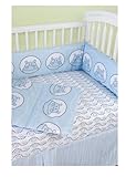 - Four piece crib set includes quilt, bumper, sheet, and skirt